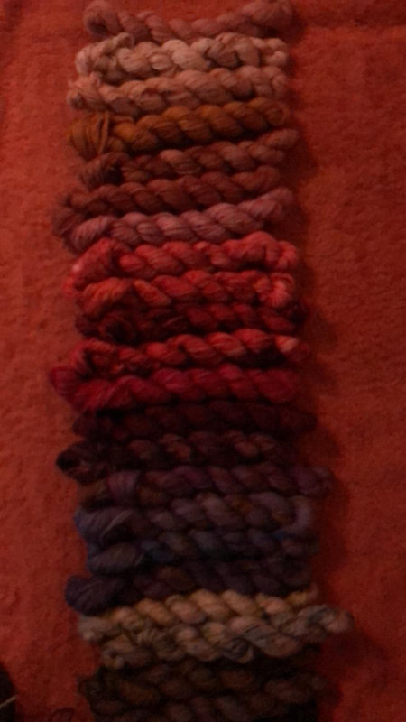 24 pudełeczka, 24 mini motki (20–25 g), każdy ręcznie farbowany w odcieniach jesiennych liści , winobluszczu i wrzosu.